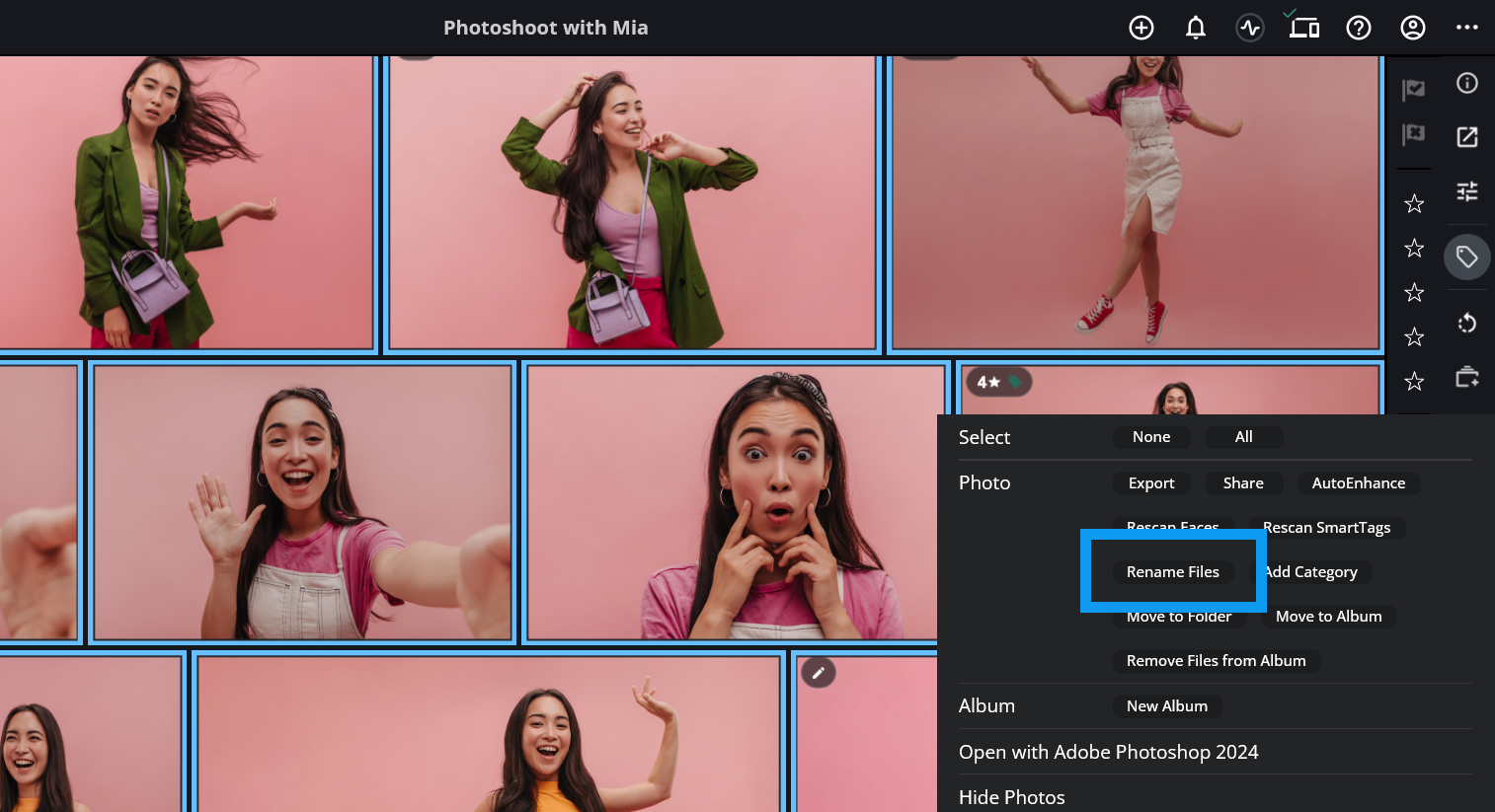 Right-click your selection or tap the kebab icon in the right sidebar to access the Actions menu and select Rename Files.