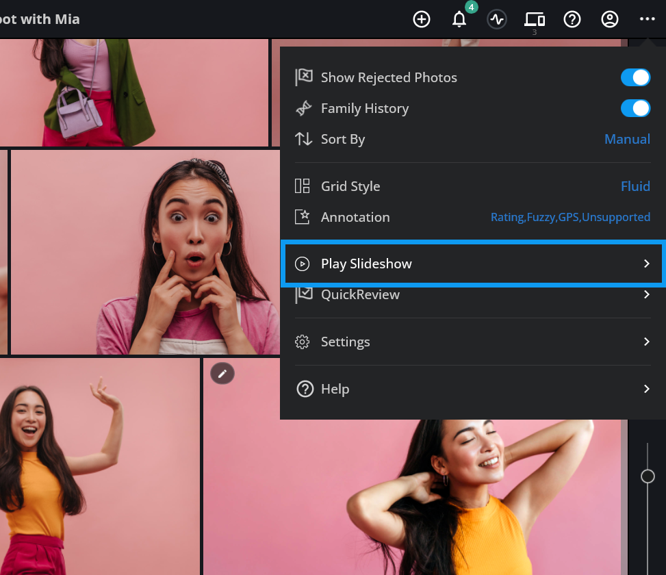 Automatic Slideshows let you quickly display a Folder or Album of photos in a slideshow format within the Mylio Photos application.