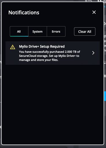 If you purchased SecureCloud storage via the Mylio account website but have not yet set up Mylio Drive+ in the Mylio Photos application, you may see a notification that states:
