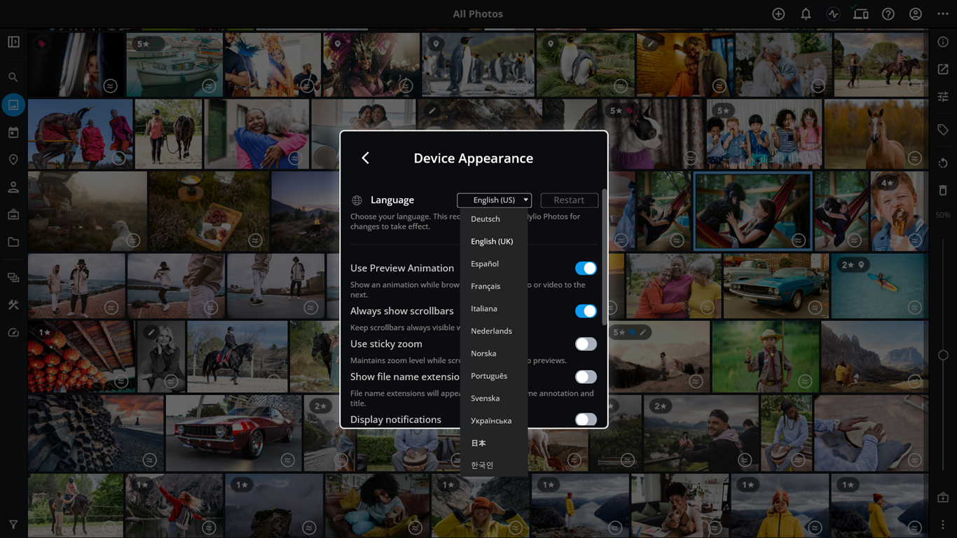 Tap the Restart button. Mylio Photos will relaunch with the selected language.