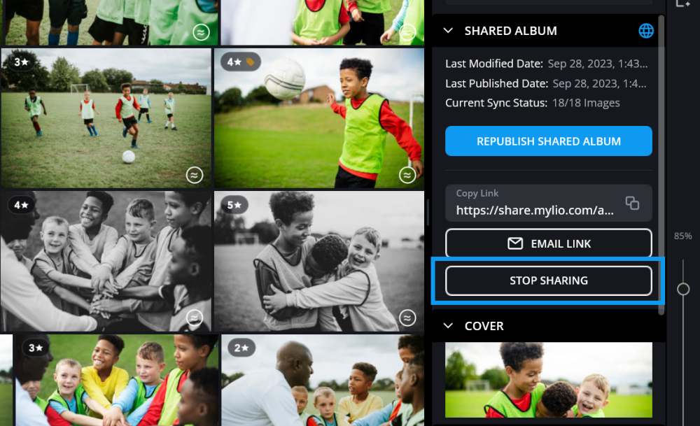 Click the Stop Sharing button to unpublish your Shared Album from the internet. This will not remove the Album from your Mylio Photos Library.