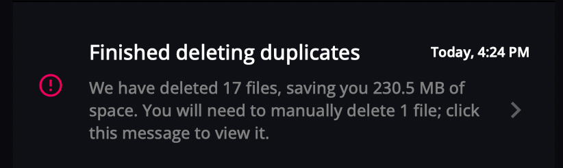 If you encounter a “Failed Verification” error in the Notifications panel while using the Photo DeDupe tool in Mylio Photos, it means the tool couldn’t confirm that the file is an exact duplicate. To avoid accidental data loss, Mylio requires you to review and delete these files manually.