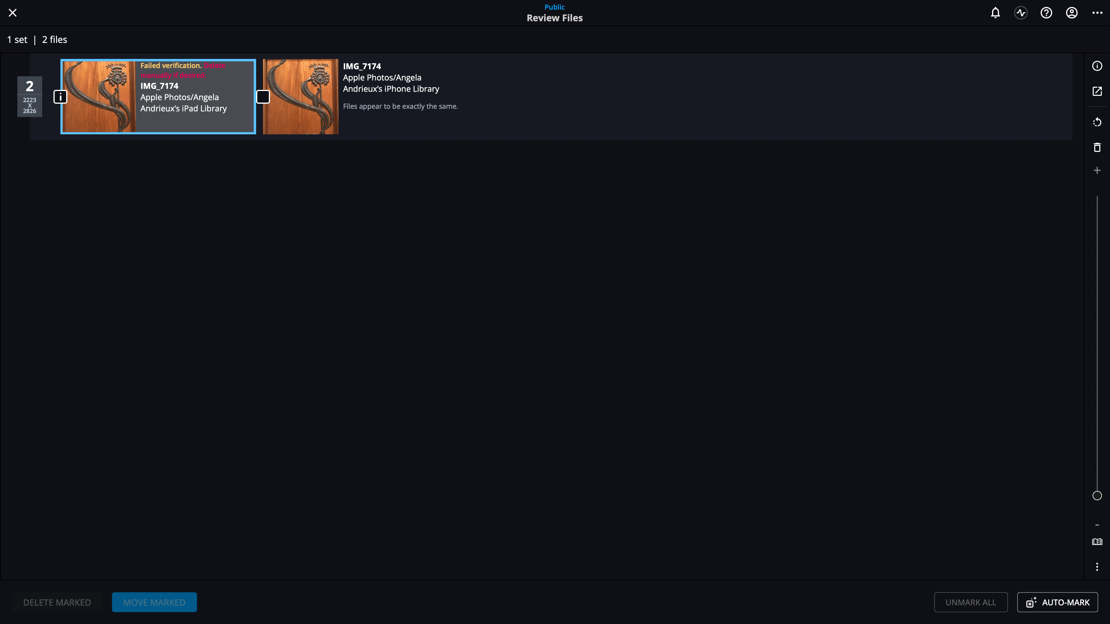 To ensure the accuracy of deletions, Mylio performs a second hash check during the deletion process. If any file’s hash differs from its initial scan, it fails verification. This secondary check prevents unintentional deletion of non-duplicate files, even if they appear visually similar. Files that fail this check are flagged with the “Failed Verification” status and require manual review.