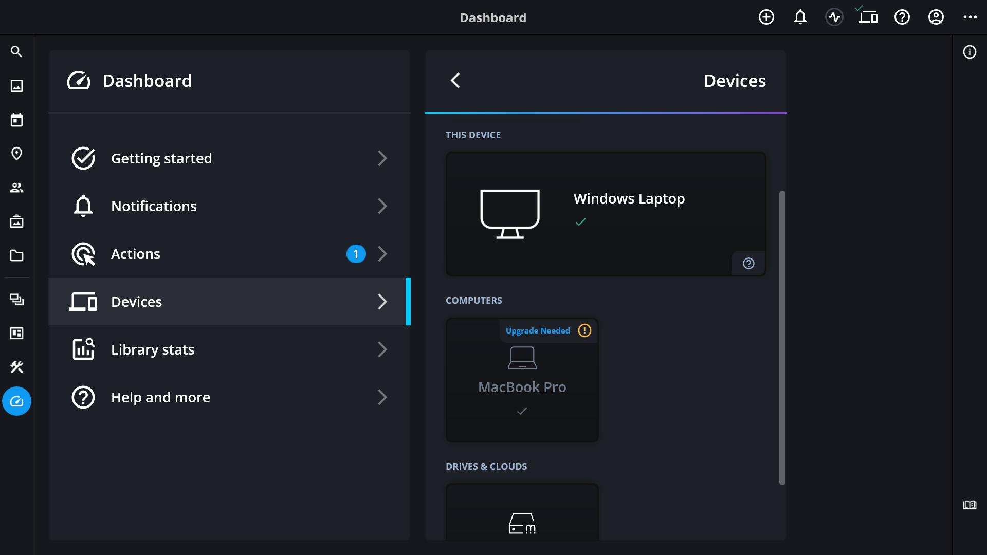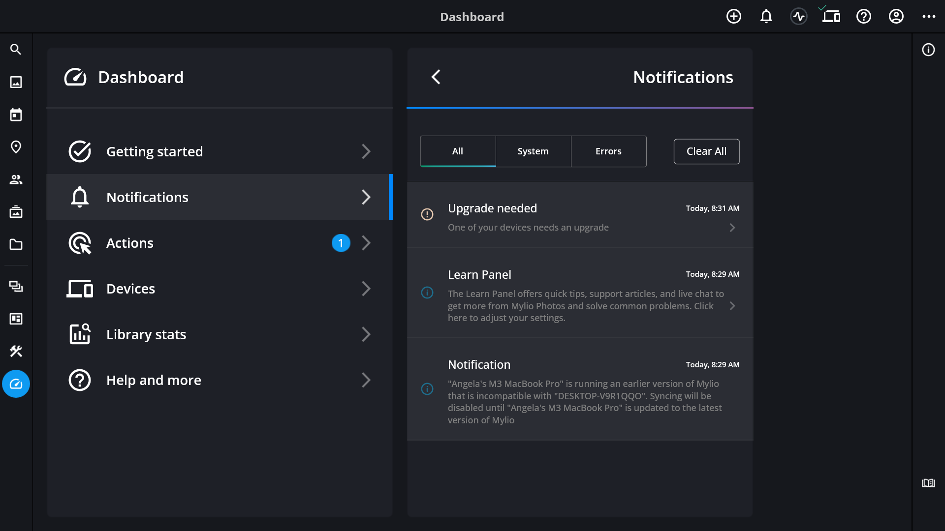 After updating Mylio Photos, you might see a message that says one of your devices needs an upgrade. This usually means a connected device—like a hard drive or another computer—needs to sync with the latest version.
