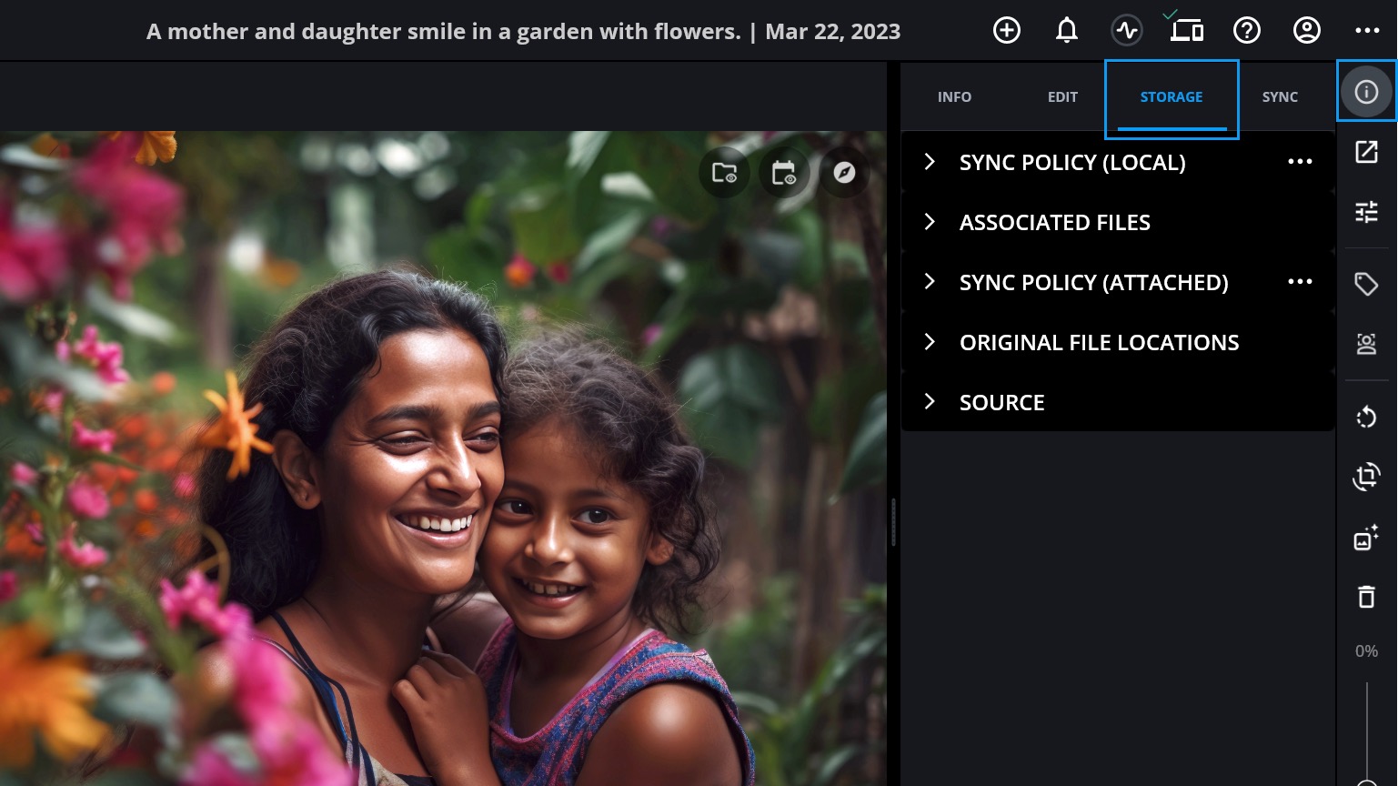 To access the Storage Panel, select a single image, then click the info icon