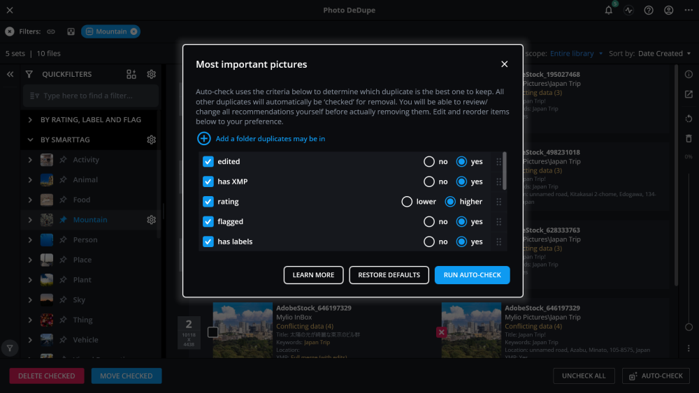 When enabled, Auto-Check will scan the duplicate files and determine the best photos and videos to keep based on the criteria you select. All other duplicates will be “checked” for removal.